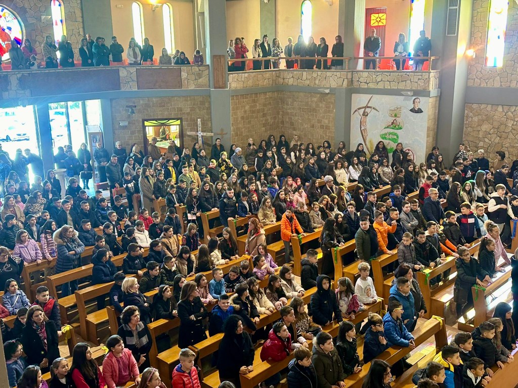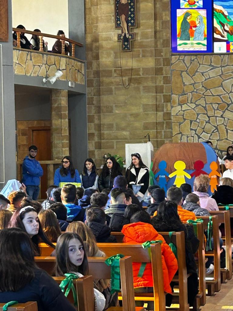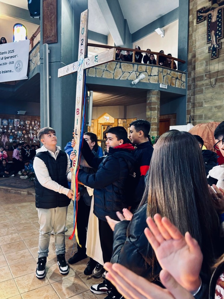 La santa messa si è conclusa con un atto simbolico ed emozionante tra i ragazzi del catechismo e il Gruppo Giovanile B.A.M.V. Il gesto consisteva nello scambio di due doni: i ragazzi del catechismo hanno donato ai ragazzi del Gruppo Giovanile una scatola contenente i loro desideri, ed in cambio, il Gruppo Giovanile ha percorso la navata centrale sollevando la Croce Giubilare per donarla ai ragazzi del catechismo, atto compiutosi all’insegna dell’unione.