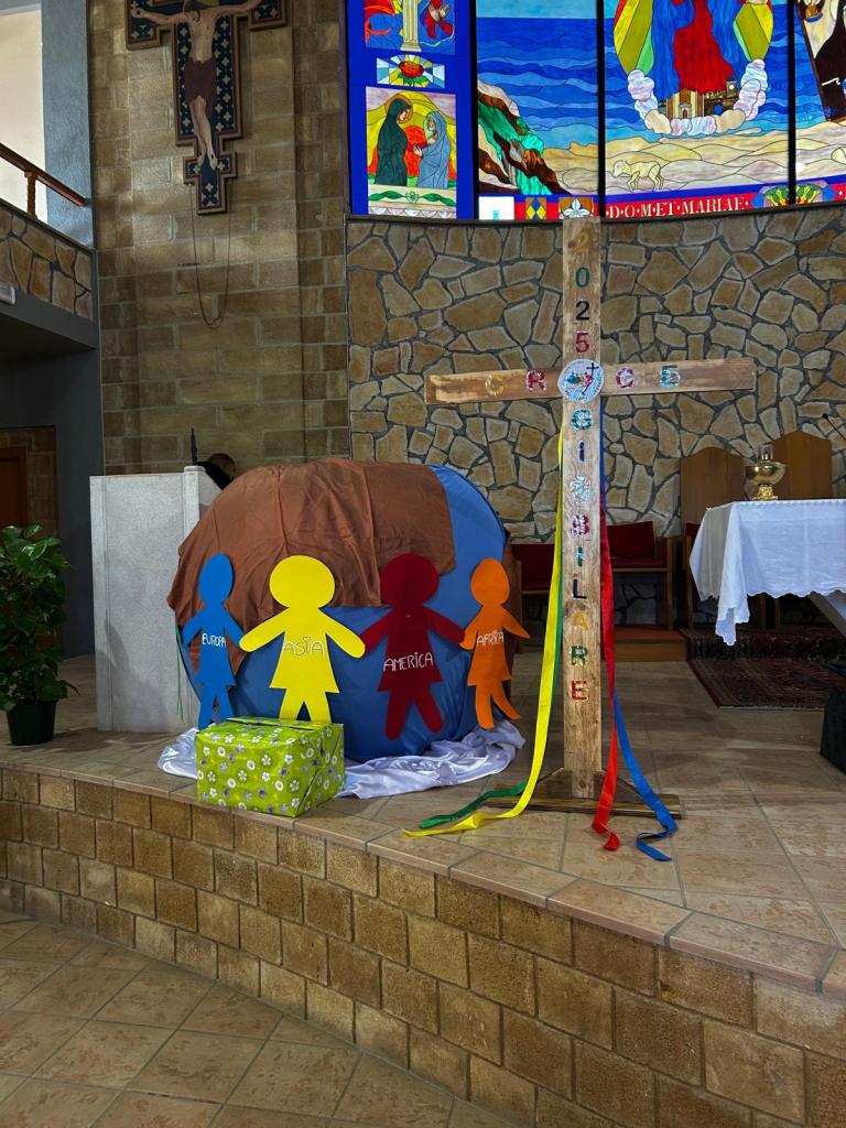 In occasione di questa giornata, l’altare è stato decorato da simboli rappresentativi: da un lato lo scettro, la corona e il trono per rappresentare la superbia dei potenti e la corona di spine per rappresentare Cristo il quale, con la bontà e la carità, ha rovesciato i potenti dai troni; dall’altro lato è stata posta una rappresentazione del mondo con cinque figure simbolo dei cinque continenti, affinché venisse sottolineata l’unione mondiale tra i giovani in un mondo in cui regnano diversità e odio.